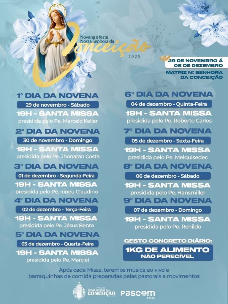 O Novenário começou no dia 29 de novembro e segue até o dia 7 de dezembro, sempre às 19h. Assim como nas edições anteriores, todas as paróquias do município participam das celebrações. Após as missas, o público poderá acompanhar apresentações musicais com artistas locais.