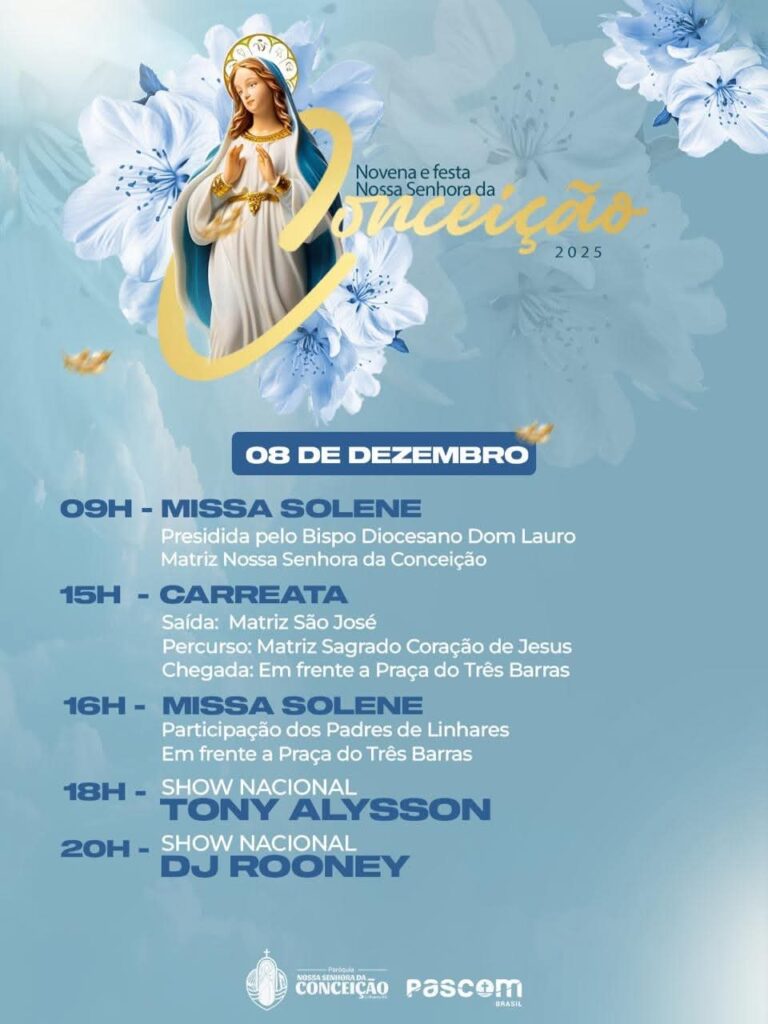 No dia 8 de dezembro, a programação será intensa. A solenidade eucarística em honra à Nossa Senhora da Conceição será presidida pelo Pe. Maurício, às 16h, reunindo todos os padres e diáconos das paróquias de Linhares. O dia contará ainda com Terço dos Jovens, carreata com a imagem da padroeira e shows nacionais com Tonny Allysson e DJ Rooney Moura, no palco montado em Três Barras.