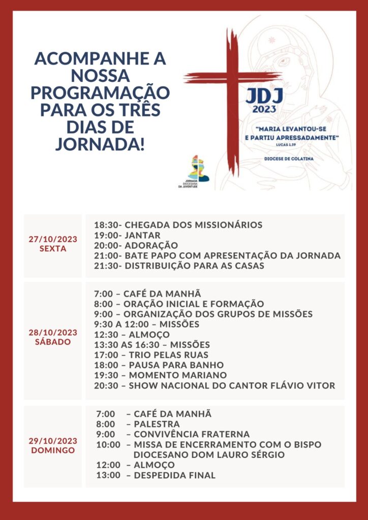 A 6º Jornada Diocesana da Juventude (JDJ) acontece de 27 a 29 de outubro na Paróquia São João Paulo II, em Linhares. O tema escolhido para esta edição é “Maria, levantou-se e partiu apressadamente” (cf. Lc 1, 39), em sintonia com a Jornada Mundial da Juventude (JMJ) Lisboa 2023.