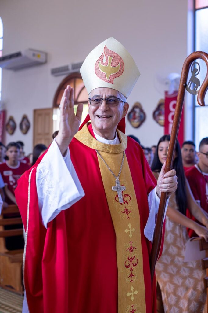 A Santa Missa foi presidida pelo bispo diocesano, Dom Lauro Sérgio Versiani Barbosa, que conferiu o sacramento aos crismandos. Durante a celebração, o bispo destacou a importância da Crisma como fortalecimento da fé e envio missionário, incentivando os jovens a se tornarem testemunhas vivas de Cristo na Igreja e na sociedade.