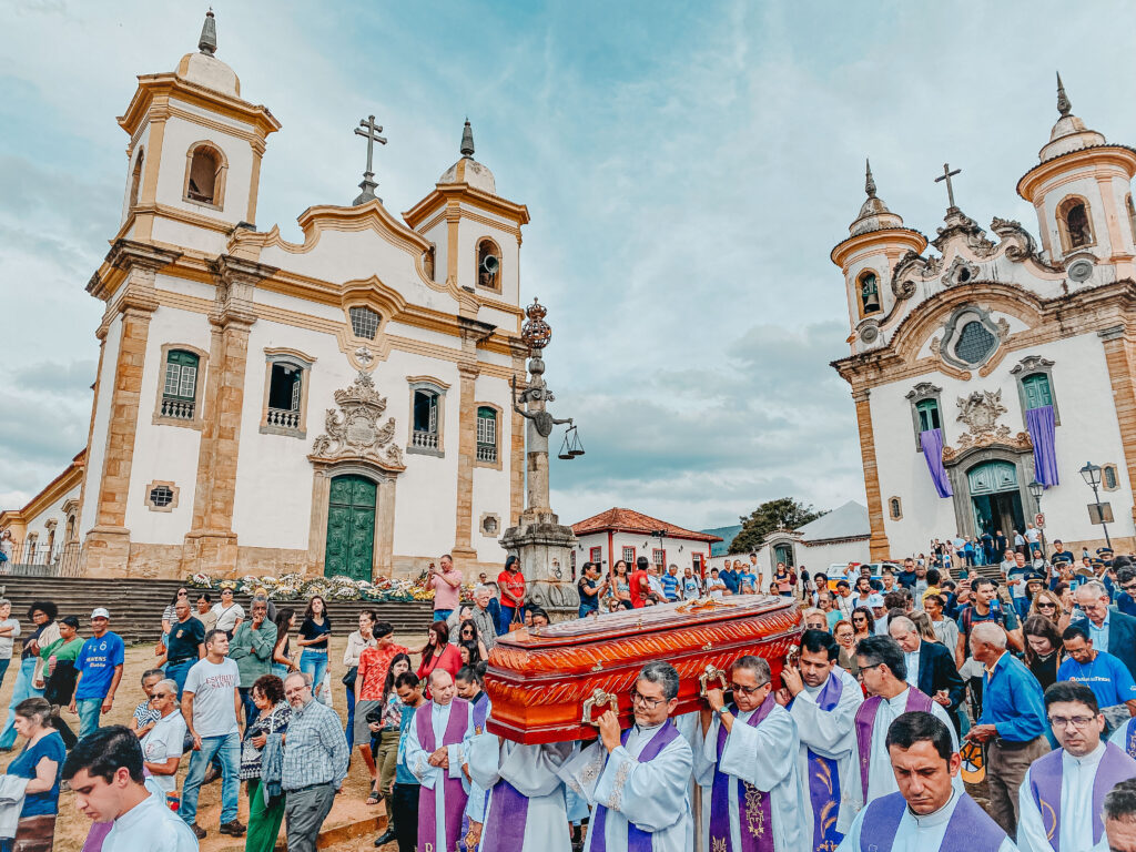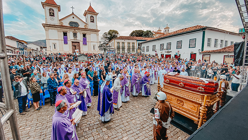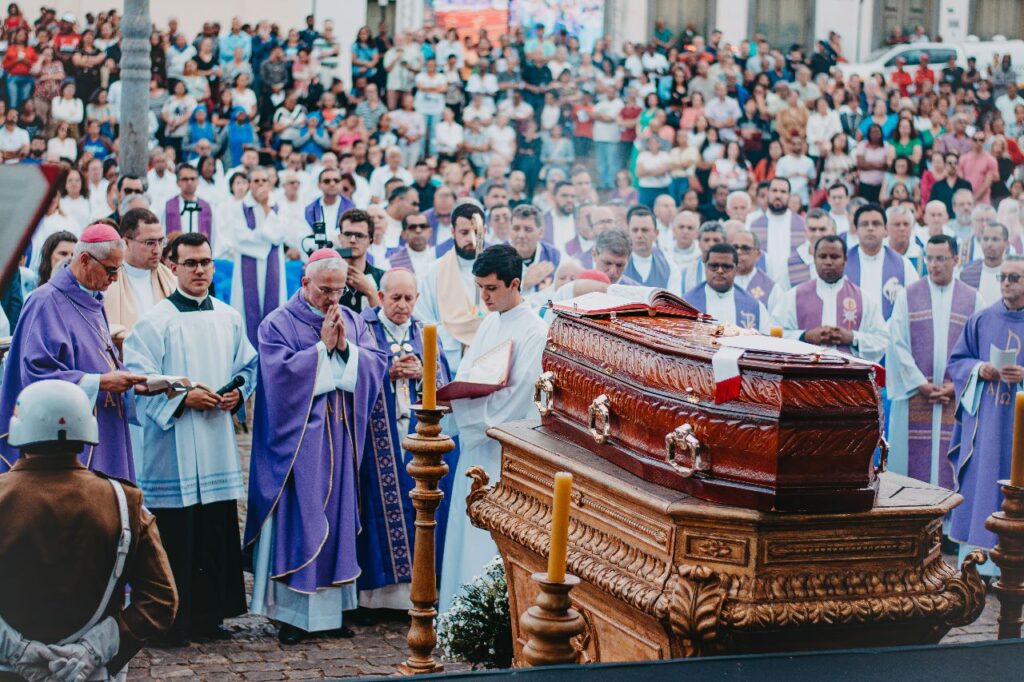 Com profunda emoção, as insígnias episcopais, o anel e a cruz, foram solenemente retirados, simbolizando a expectativa de sua ressurreição e o legado deixado em sua trajetória como pastor da comunidade. Todos seguiram em cortejo do Santuário Arquidiocesano de Nossa Senhora do Carmo em direção à Praça Cláudio Manoel, onde foi celebrada a última missa exequial.