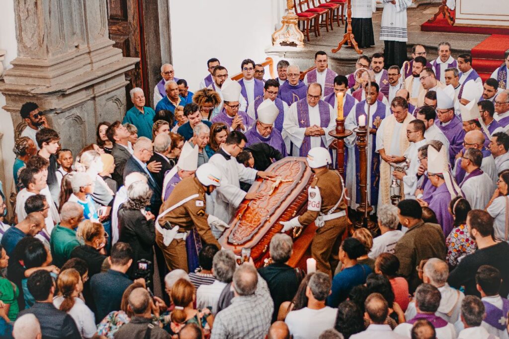 Com profunda emoção, as insígnias episcopais, o anel e a cruz, foram solenemente retirados, simbolizando a expectativa de sua ressurreição e o legado deixado em sua trajetória como pastor da comunidade. Todos seguiram em cortejo do Santuário Arquidiocesano de Nossa Senhora do Carmo em direção à Praça Cláudio Manoel, onde foi celebrada a última missa exequial.