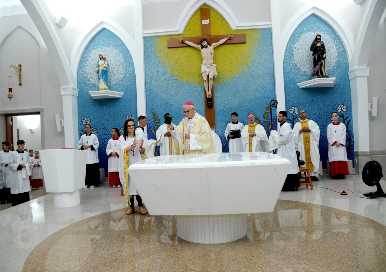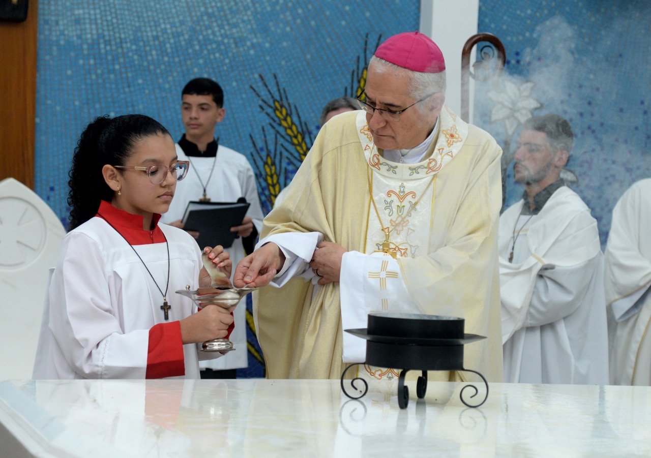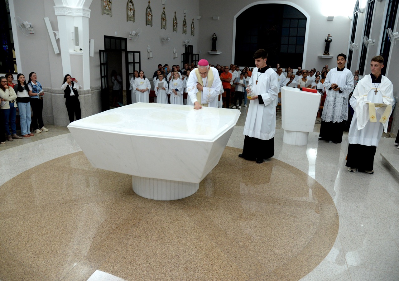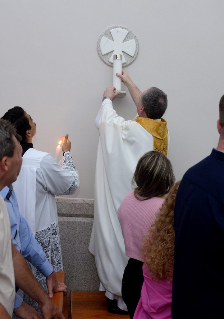 Após a homilia, Dom Lauro deu continuidade com o ritual com a prece de dedicação e consagração e a unção do altar e das paredes da Igreja.