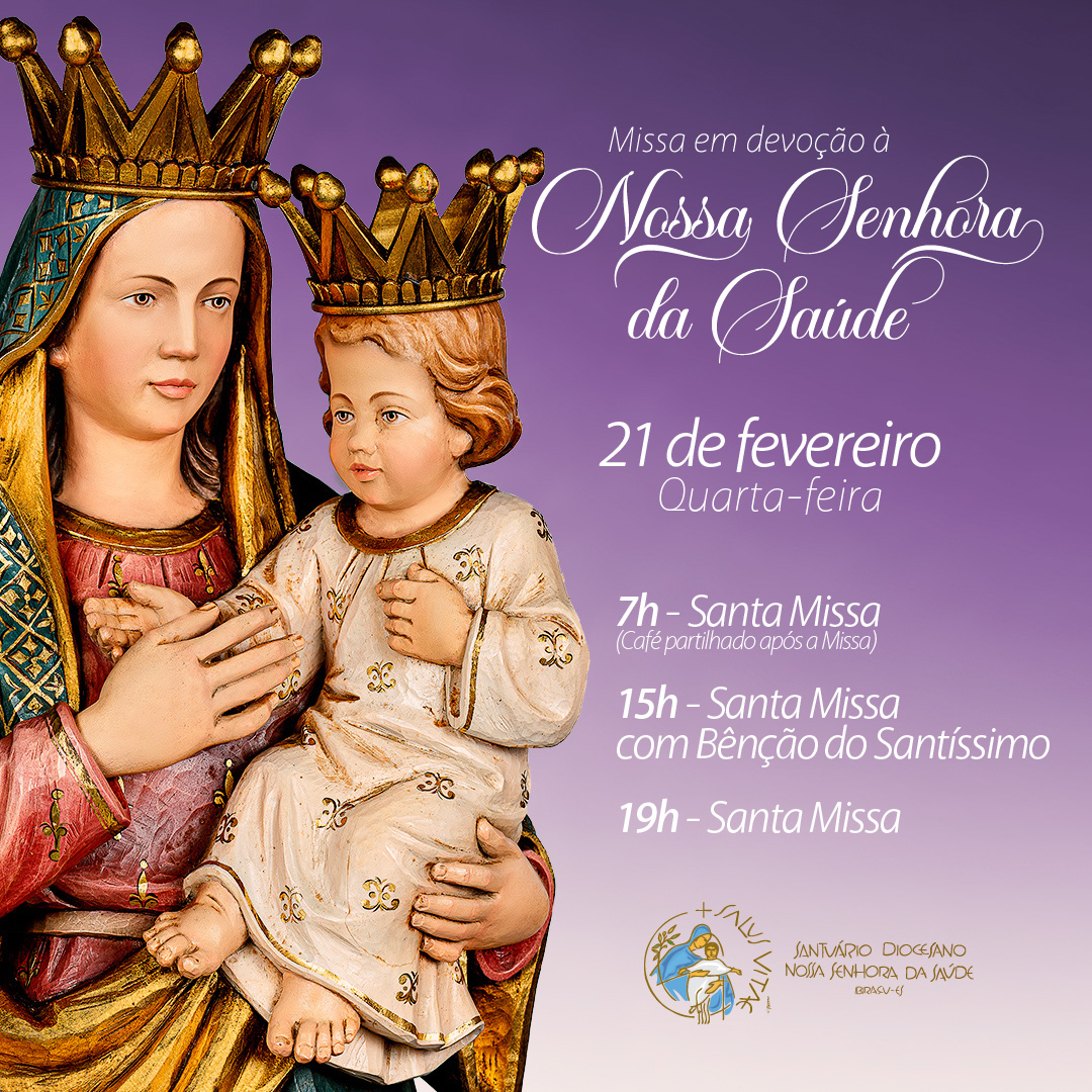 Se aproxima o dia 21 de fevereiro e, como de costume em nosso Santuário Diocesano Nossa Senhora da Saúde, celebramos a devoção de Nossa Senhora da Saúde. No próximo dia 21, quarta-feira, a programação conta com a Missa às 7h da manhã, seguida de exposição ao Santíssimo, que permanecerá exposto para adoração até às 15h, horário da Santa Missa para Idosos e enfermos, onde será proferida a Bênção com o Santíssimo Sacramento.