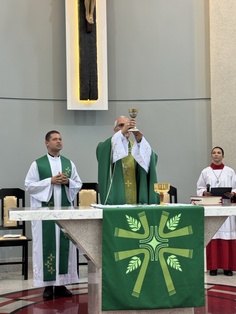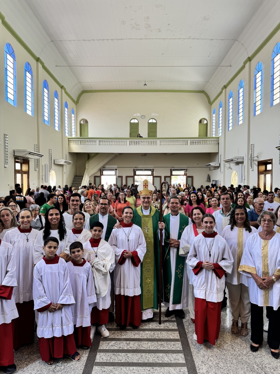 Dom Lauro, logo no início da celebração, acolheu os presentes com entusiasmo: “É uma alegria que pela primeira vez celebremos aqui com esta comunidade no dia da Festa do Coração Eucarístico de Jesus, a quem é dedicada esta paróquia! Confiamos no Deus que nos ama e nos convida a seguir. Façamos o sinal que nos identifica como seguidores de Cristo”.