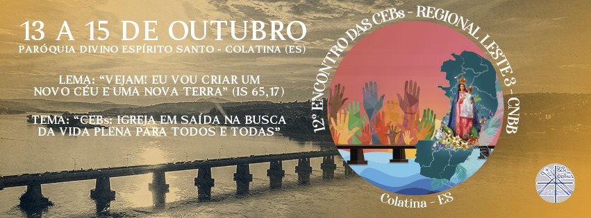 O Regional Leste 3 da CNBB promoverá o 12º Encontro das Comunidades Eclesiais de Base (CEBs), que vai acontecer na Diocese de Colatina, de 13 a 15 de outubro. São esperados representantes de todas as quatro dioceses do Espírito Santo que juntas vão refletir o tema “CEBs: Igreja em saída na busca da vida plena para todos e todas” e o lema “Vejam! Eu vou criar um novo céu e uma nova terra”.