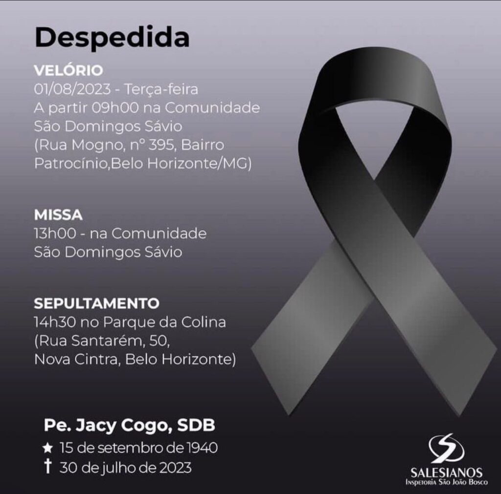 É com profundo pesar que comunicamos o falecimento do padre Jacy Cogo, religioso salesiano, ocorrido em Belo Horizonte (MG) na noite do último domingo (30/7). Padre Jacy tinha 82 anos e faleceu em casa.