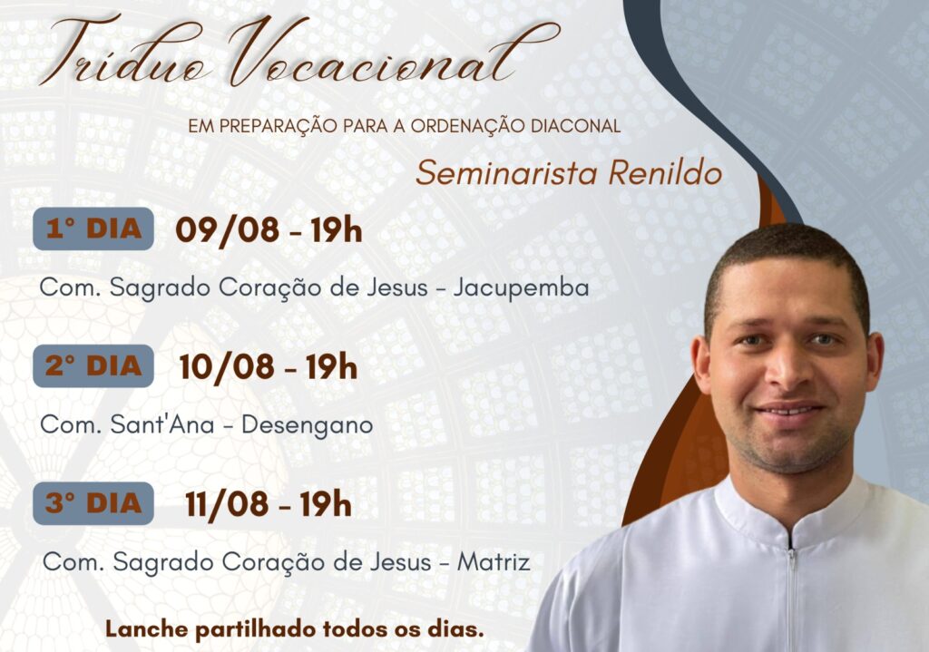 Renildo é natural de Ibiraçu e cumpre seu último estágio pastoral da Paróquia Coração Eucarístico de Jesus, que fica em Guaraná, Aracruz, onde acontece um tríduo preparatório para sua ordenação. Será de quarta a sexta-feira (9 a 11/8) nas comunidades de Jacupemba, Desengano e matriz.