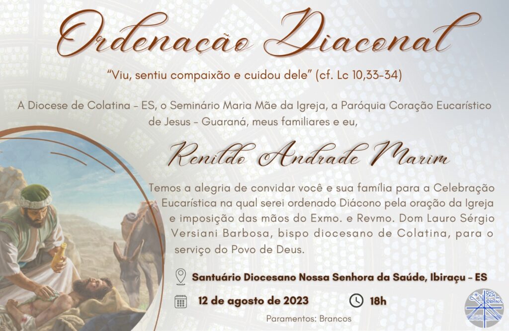 Pela imposição das mãos de nosso bispo diocesano, dom Lauro Sérgio Versiani Barbosa, o seminarista Renildo Andrade Marim será ordenação diácono no próximo sábado (12/8), às 18 horas, no Santuário Diocesano Nossa Senhora da Saúde, em Ibiraçu.