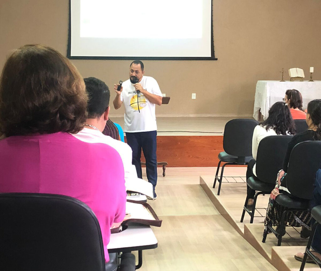 O padre Joseumar Miranda, pároco da Paróquia São Domingos, de São Domingos do Norte, reuniu seus catequistas e ministros da Palavra para um momento de formação na manhã do último dia 2 de setembro. À tarde, ele conduziu o mesmo tema juntamente com as lideranças da Paróquia Nossa Senhora Auxiliadora, de Marilândia.
