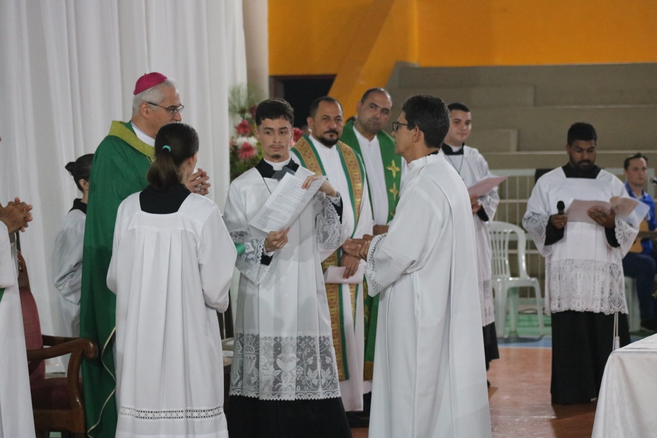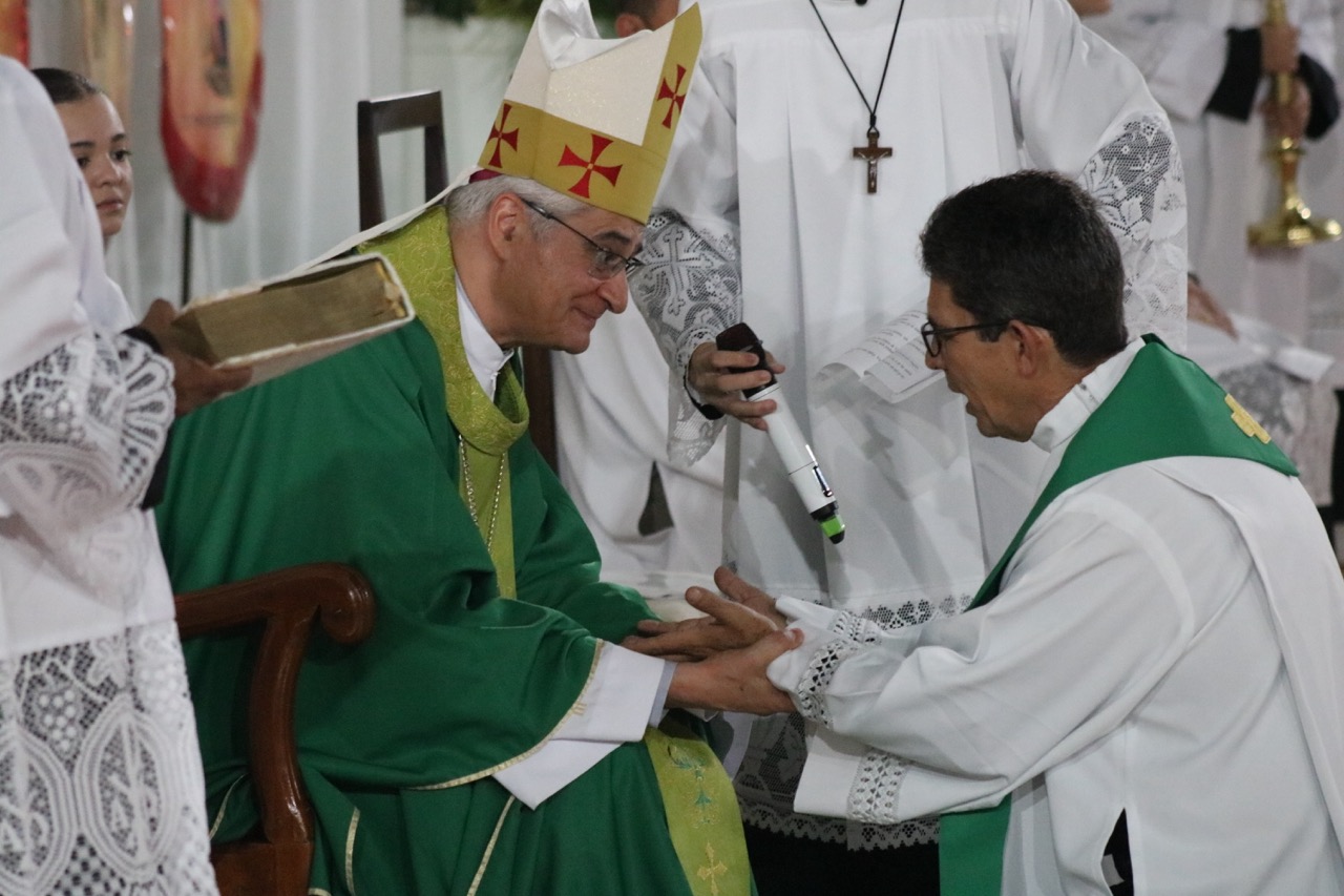 Ele ainda destacou o significado da estola, um dos símbolos recebidos por Padre Neil durante o rito. “Vejam como entrou aqui o Padre Neil, o novo pároco, apenas com a túnica, e recebeu a estola, sinal do serviço. Assim como Cristo que, na última ceia, se levanta da mesa, tira o manto, cinge-se com uma toalha e começa a lavar os pés dos discípulos. A estola lembra isso também. E foi dito a ele: ‘Recebe esta estola para que exerça o seu ministério como Cristo, que veio não para ser servido, mas para servir e dar a sua vida em favor de muitos’”, explicou Dom Lauro.