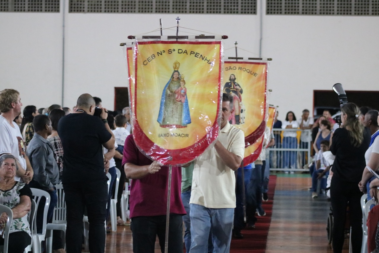 Em seguida, os fiéis acolheram os estandartes dos padroeiros das diversas comunidades que compõem a Paróquia São Sebastião. Este gesto simbolizou a comunhão e a acolhida ao novo pároco. Dom Lauro destacou a importância da colaboração entre pároco e comunidades.