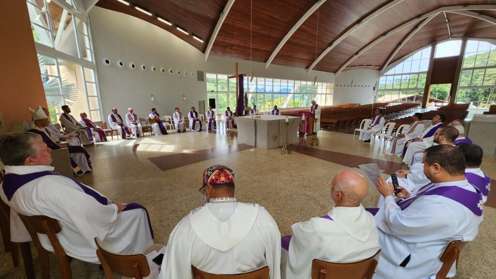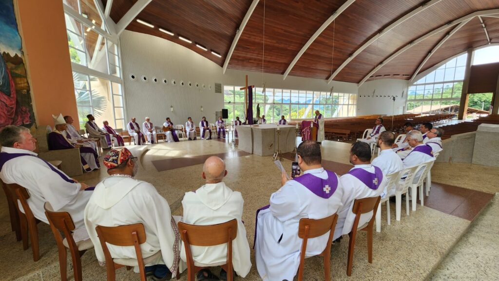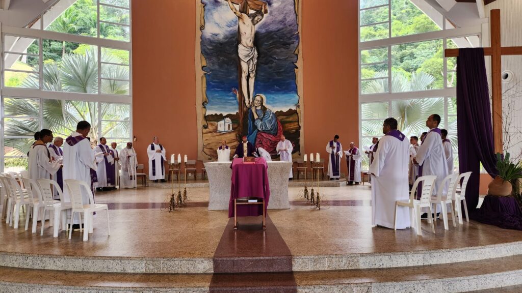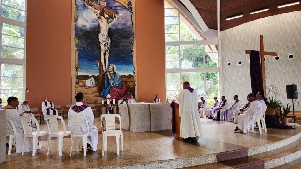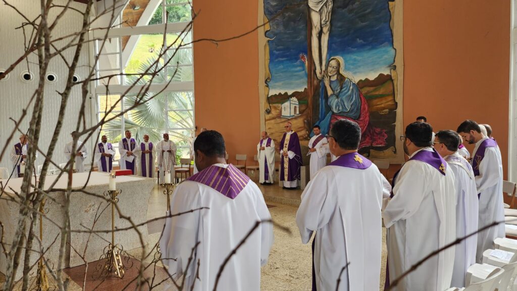 Ao chegar no Santuário, os padres se dirigiram a Capela histórica, onde concluíram as com a Liturgia das Horas e, em seguida, foi celebrada a missa de encerramento do retiro, no Santuário. A missa foi privada aos padres e presidida pelo bispo diocesano, Dom Lauro Sérgio Versiani Barbosa.