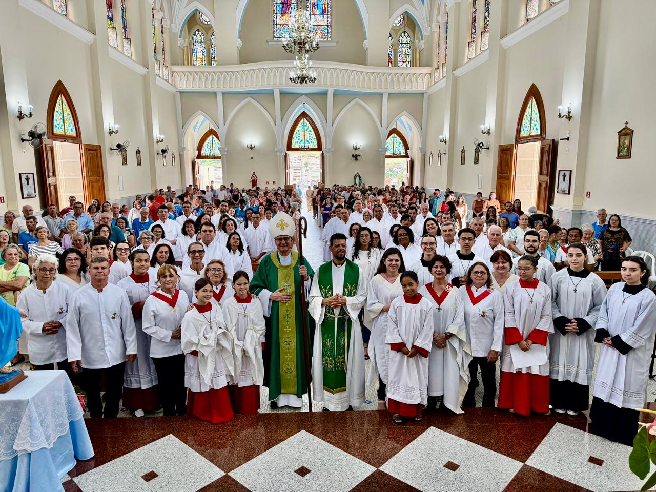 Um dos momentos mais significativos da missa foi a instituição dos Ministérios da Palavra e do Batismo, conferidos a novos ministros e ministras que passam a atuar oficialmente no serviço pastoral da comunidade. Em sua homilia, Dom Lauro destacou que os ministérios representam um dom para a Igreja e um chamado à missão, convidando os novos ministros a exercerem suas funções com humildade, zelo e testemunho de vida.