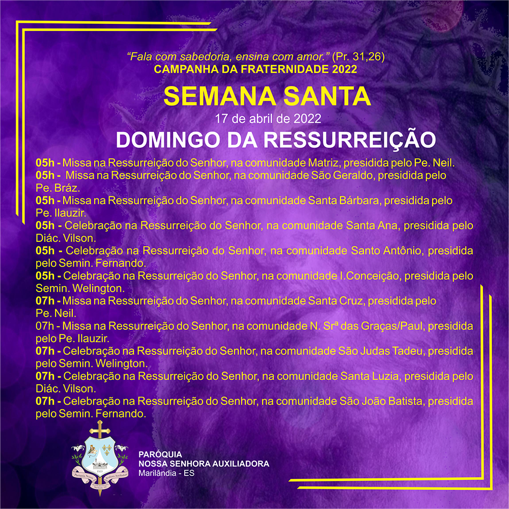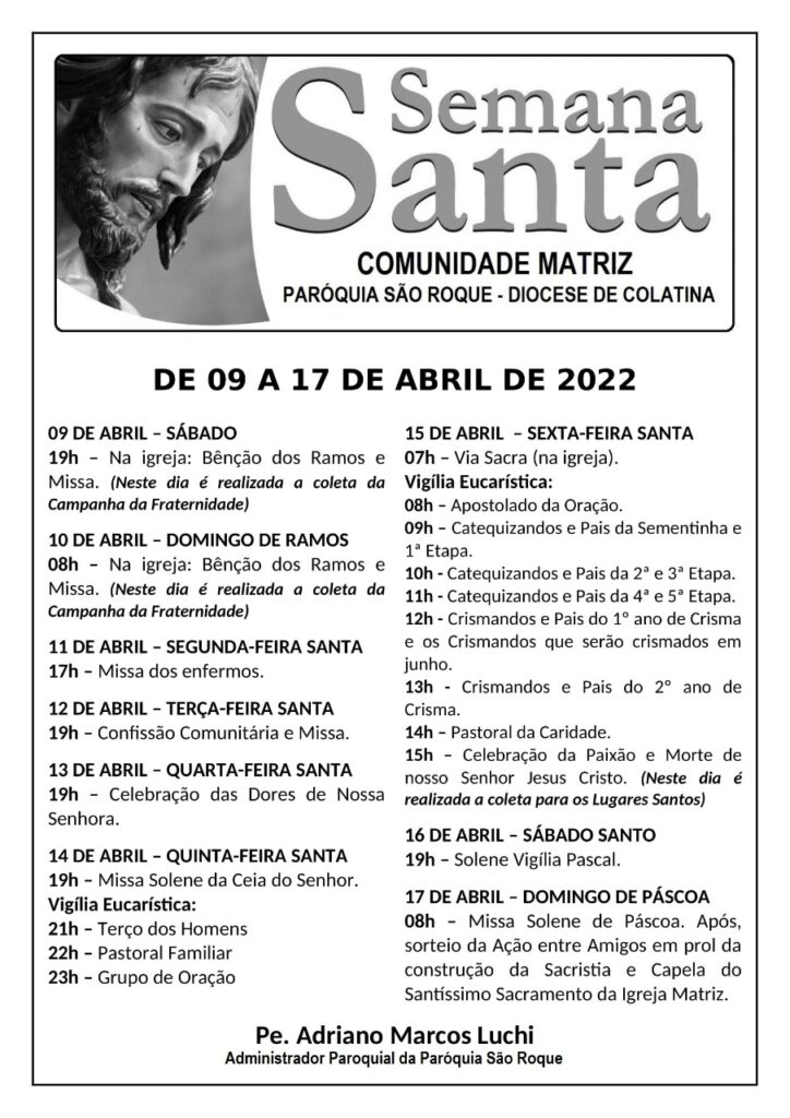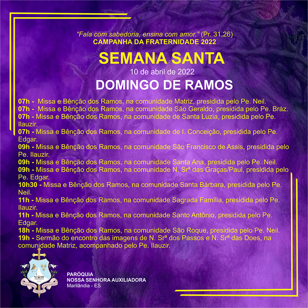 As paróquias da Diocese de Colatina estão se preparando para bem viver a Semana Santa que se aproxima. O Domingo de Ramos será no dia 10 de abril, seguindo até o Domingo de Páscoa, no dia 17 de abril.