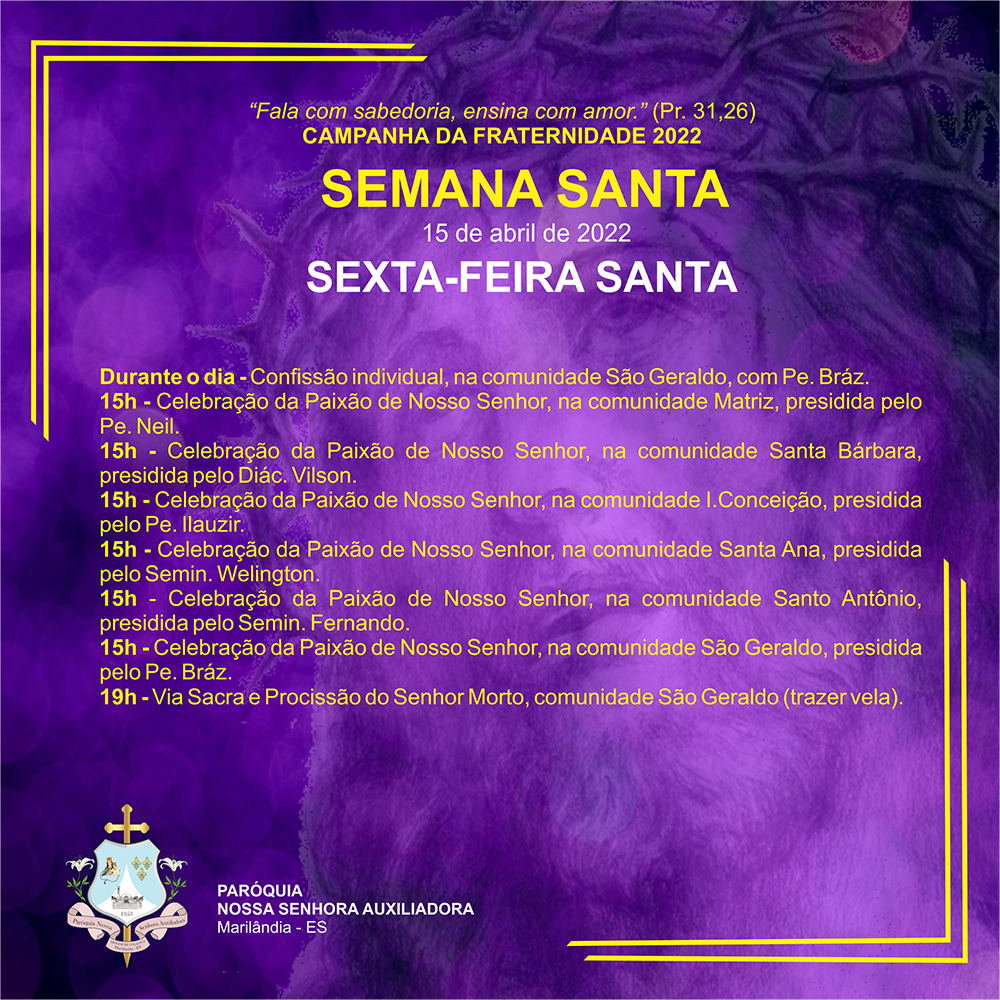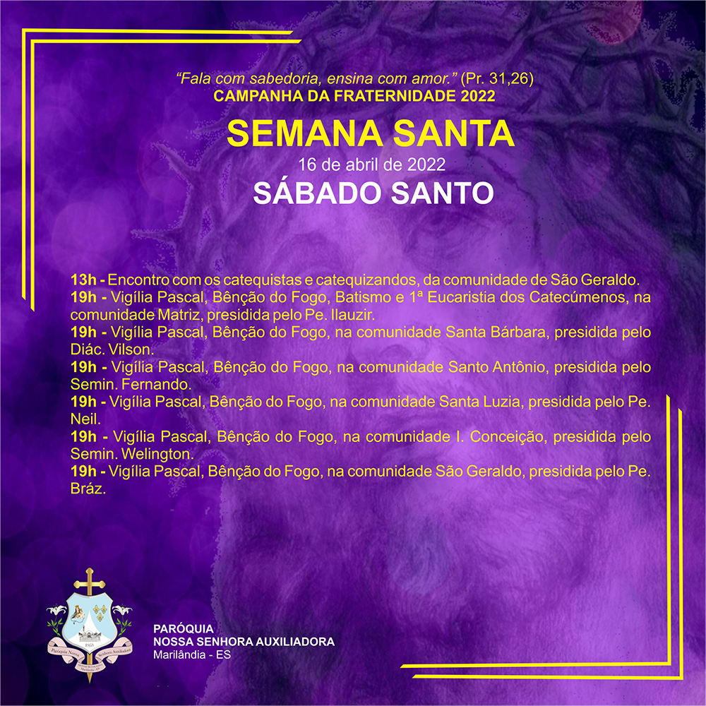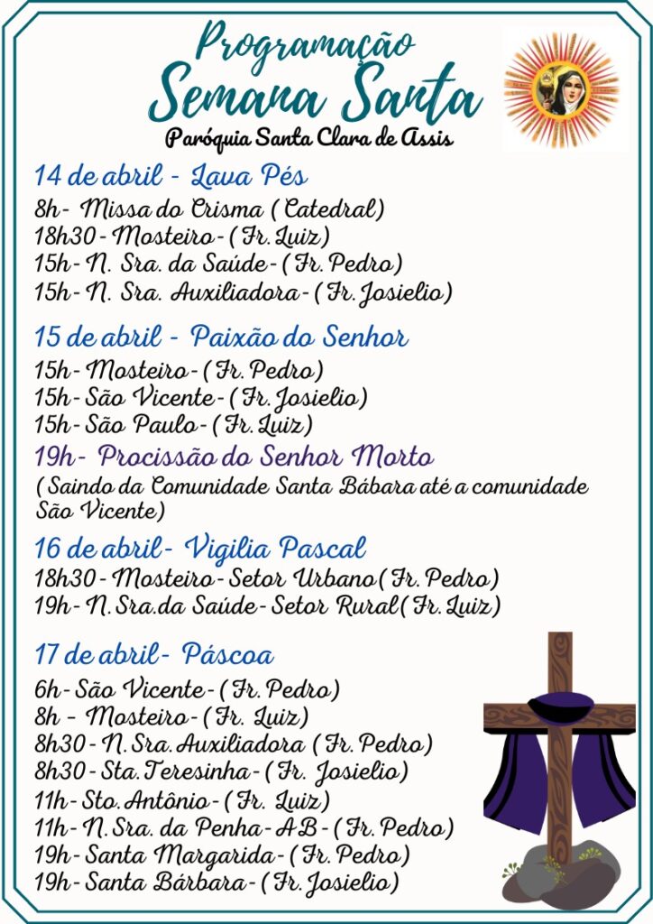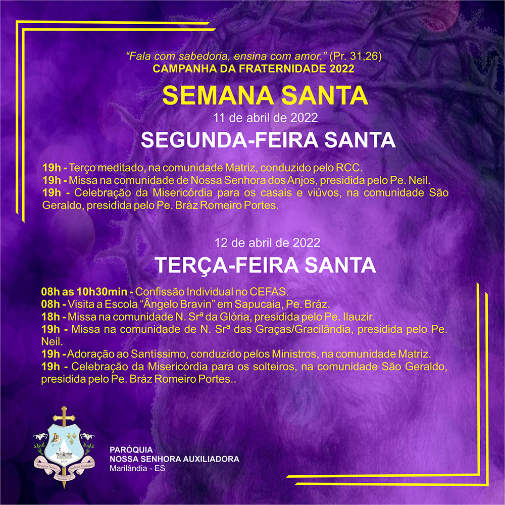As paróquias da Diocese de Colatina estão se preparando para bem viver a Semana Santa que se aproxima. O Domingo de Ramos será no dia 10 de abril, seguindo até o Domingo de Páscoa, no dia 17 de abril.