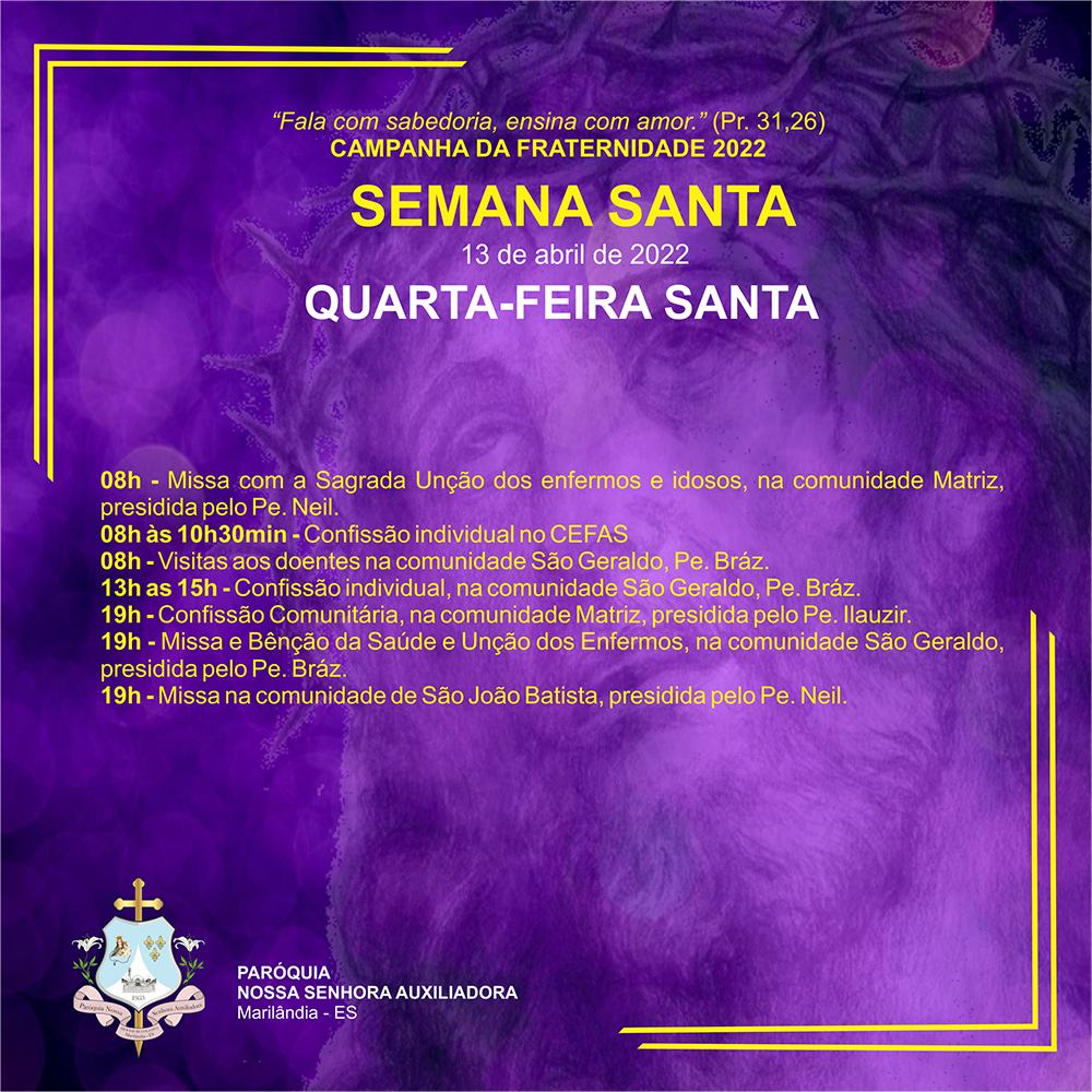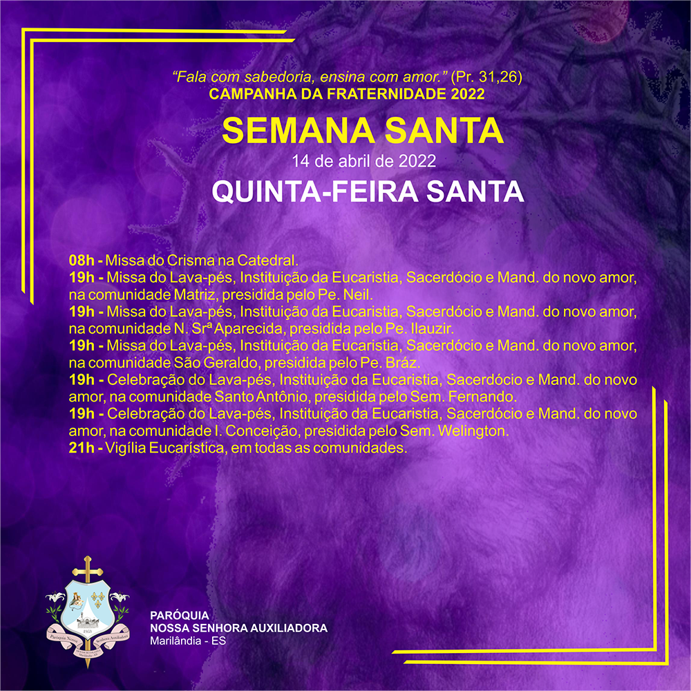 A Missa do Crisma, na Quinta-feira Santa (14/4), será às 8 horas na manhã, na Catedral de Colatina, e contará com a presença de todo o clero, além de fiéis de todas as 31 paróquias da Diocese de Colatina. A celebração será presidida pelo nosso bispo diocesano, dom Lauro Sérgio Versiani Barbosa.