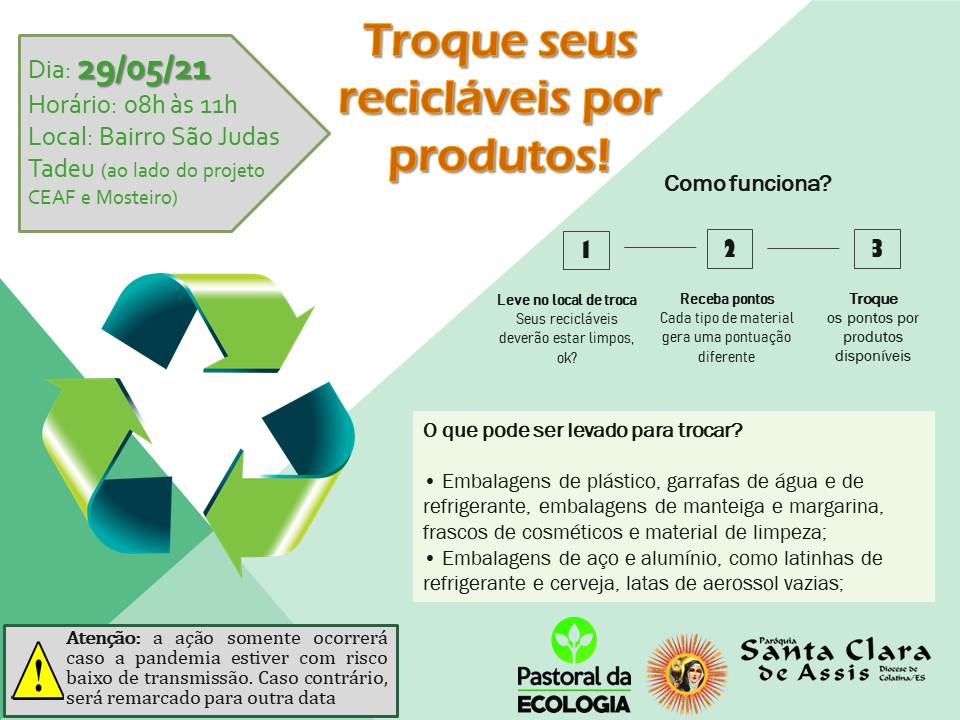 Em parceria com a Paróquia Santa Clara de Assis, a Pastoral da Ecologia promoverá, no próximo sábado (29/5), uma ação de incentivo à reciclagem: o “TROQUE SEUS RECICLÁVEIS POR PRODUTOS”. O momento será realizado ao longo de toda a manhã, no bairro São Judas Tadeu, em Colatina, próximo ao Mosteiro Santíssima Trindade.