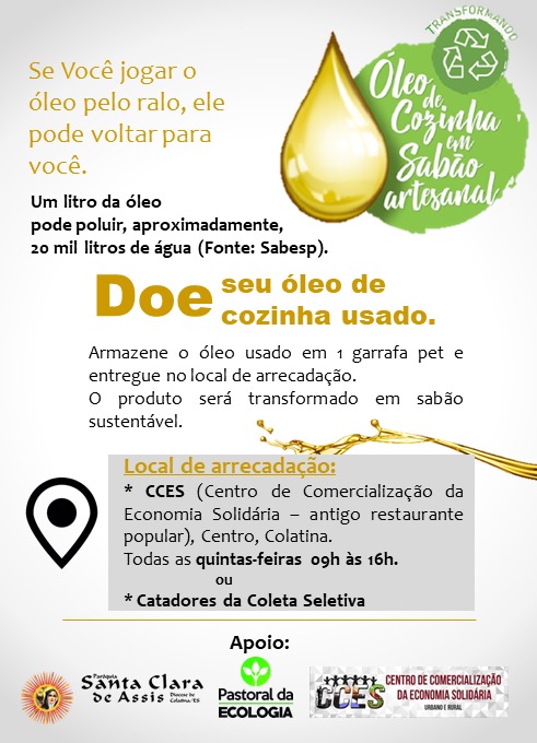 O Projeto “Doe seu óleo usado” tem o objetivo de redirecionar os óleos usados nas residências para pessoas que fazem sabão ecológico e que dependem da renda desse trabalho. O projeto segue firme e você pode deixar o seu óleo usado nas comunidades ou na secretaria da Paróquia Santa Clara de Assis; ou ainda no CCES (que fica no antigo restaurante popular da cidade), às quintas-feiras, das 9 às 15 horas.