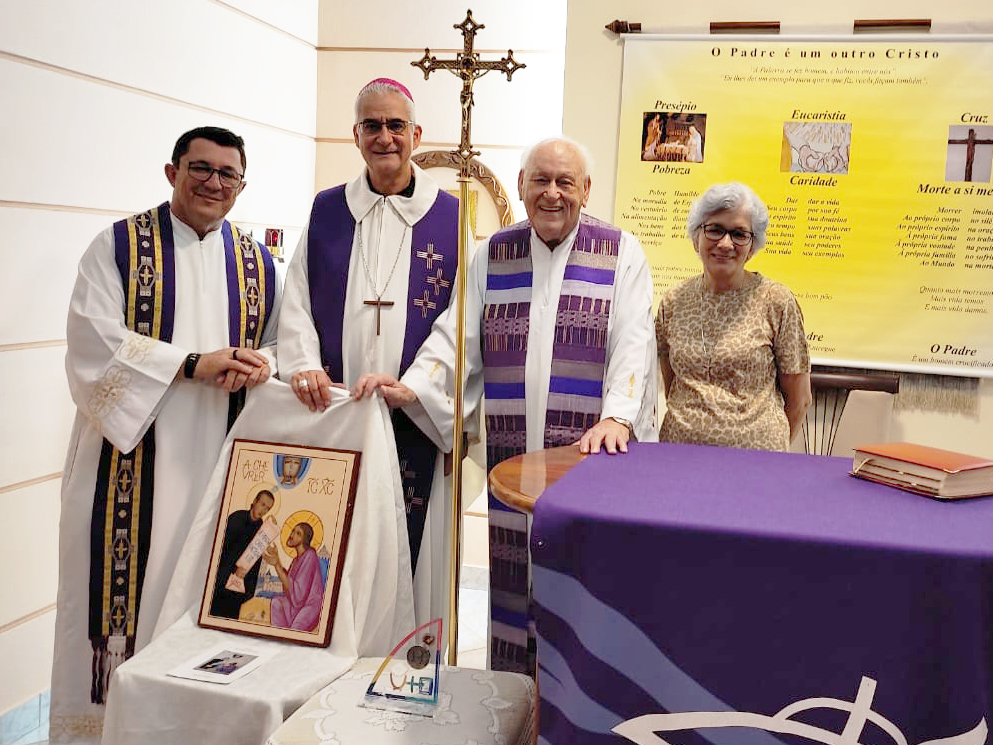 Padre Marinaldo, dom Lauro, monsenhor Duque e irmã Ivani com o ícone e a relíquia de padre Antônio Chévrier, em Colatina