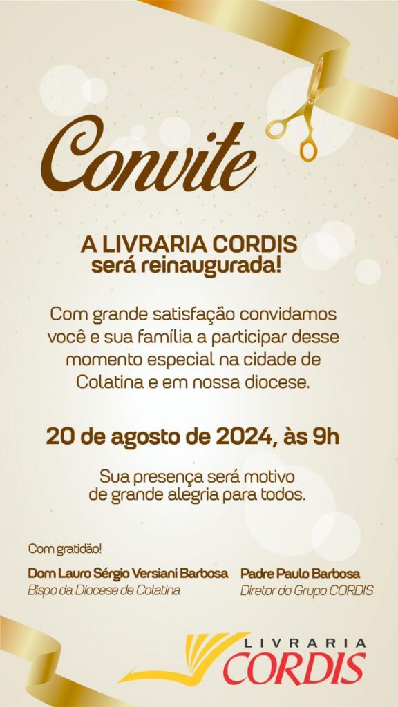A Livraria Cordis será reinaugurada! Com grande satisfação, Dom Lauro Sérgio Versiani Barbosa e Padre Paulo Sérgio Ribeiro Barbosa convidam você e sua família a participar deste momento especial na cidade de Colatina e na diocese.
