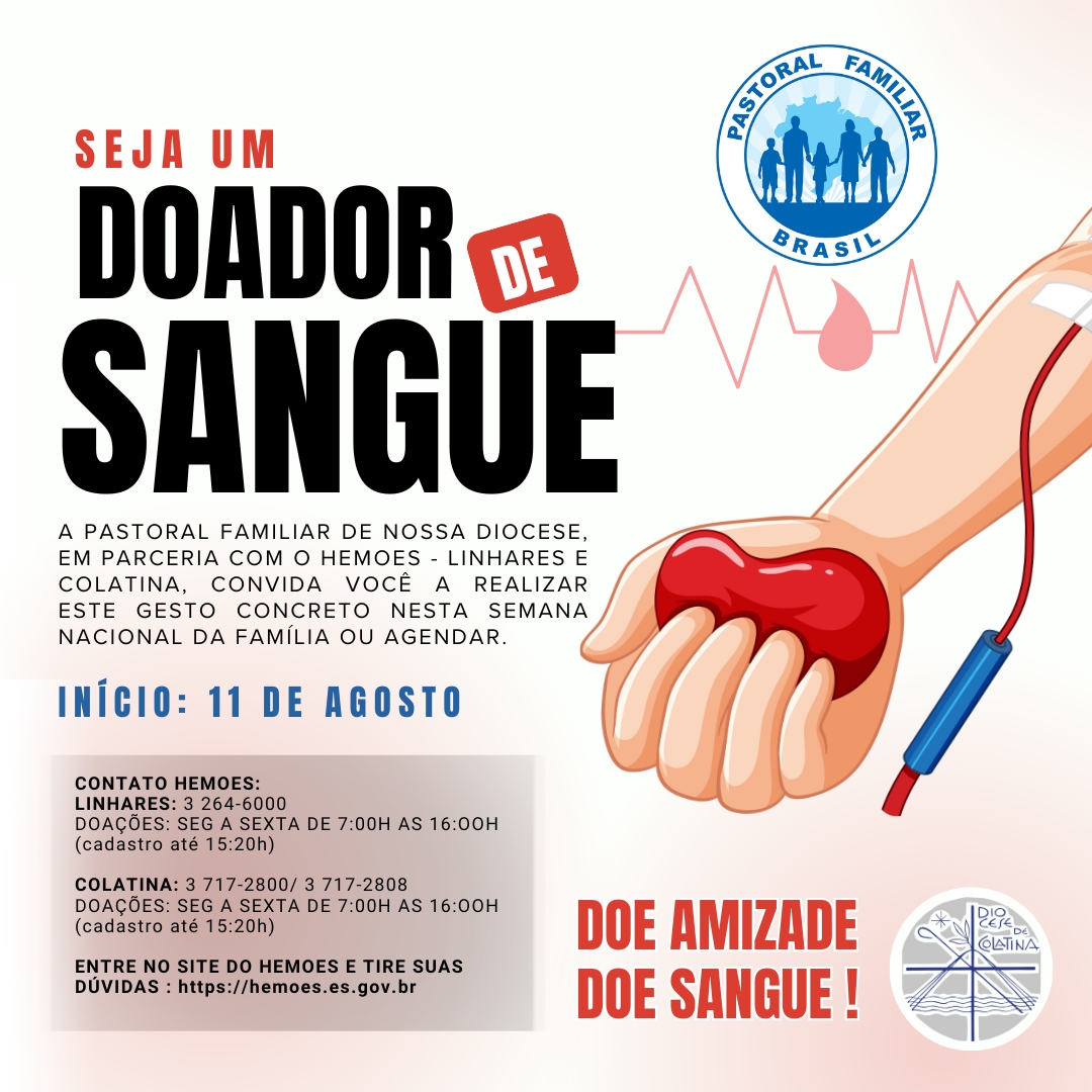 A Diocese de Colatina, por meio da Pastoral Familiar Diocesana, inicia no dia 11 de agosto de 2024, uma campanha de doação de sangue como gesto concreto durante a Semana da Família. Com o slogan “Doe Amizade, Doe Sangue”, a ação busca incentivar a doação de sangue tanto entre os agentes da pastoral quanto na sociedade em geral, ressaltando a importância desse ato de solidariedade.