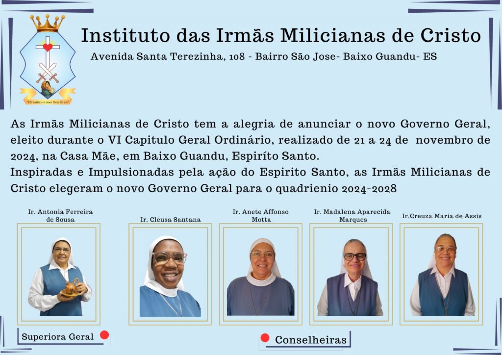 O Capítulo também foi ocasião para a eleição do novo Governo Geral do Instituto das Irmãs Milicianas de Cristo. A Superiora Geral eleita é a Irmã Antônia Ferreira de Souza, que estará acompanhada pelas Conselheiras:
